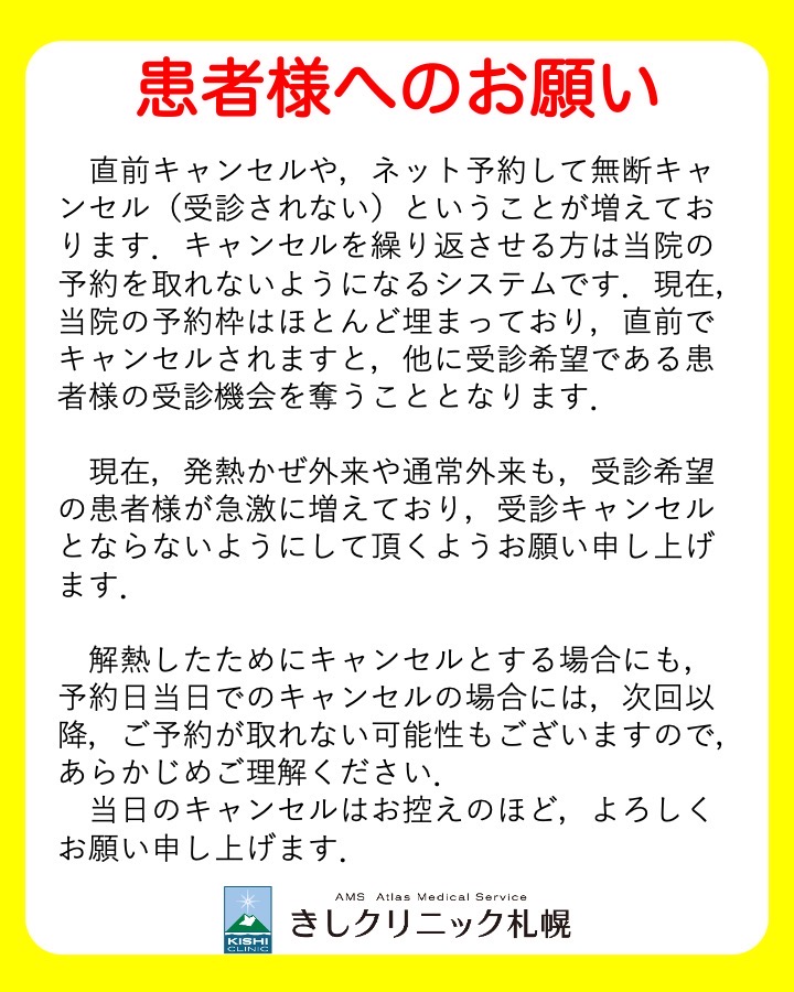 日頃から,当院を受診して下さり,誠にありがとうございます.当院では24時間ネットからご予約が可能であり,患者様から好評を頂いております.患者様のご受診が増加する一方で,直前キャンセルや無断キャンセルされる方も増えており,他の患者様がご予約を取れない事例が発生しております.