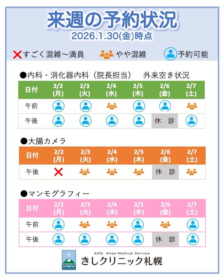 翌週以降の状況について,現在の状況を掲示致しますので,予約希望の方はご参考にして頂けますと幸いです.