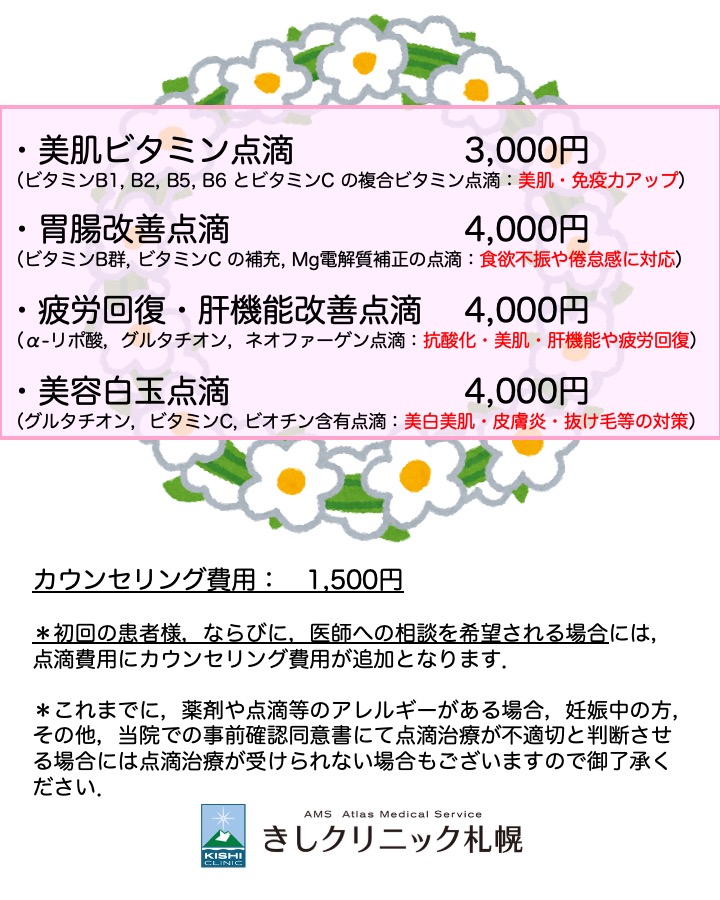 AMS きしクリニック札幌では,患者様の美容点滴のご希望にお応えしております.これまでのお時間に加えて,ランチタイムと午後のお時間にも受けられるように点滴時間枠を拡大致しました.希望枠が埋まっていることも多かった自由診療枠ですが,拡大することができましたので,お昼休みや午後の時間などに,お気軽にご受診ください.1度目のご受診については医師の診察がございますので,お時間に余裕を持ってご受診ください.