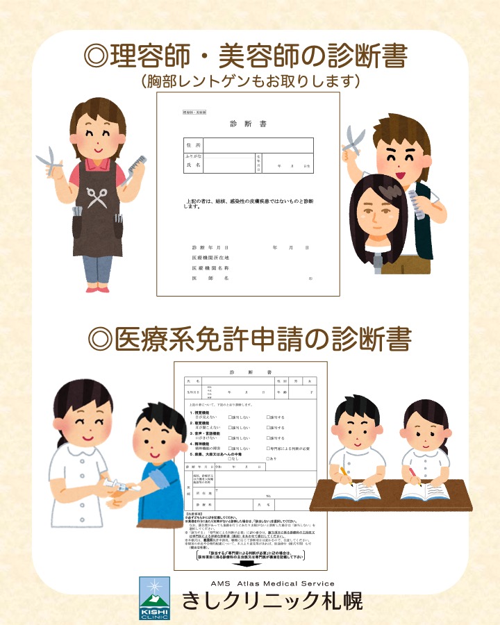 AMS きしクリニック札幌では,理容師・美容師様の診断書や医療系免許申請のための診断書にも対応しております.