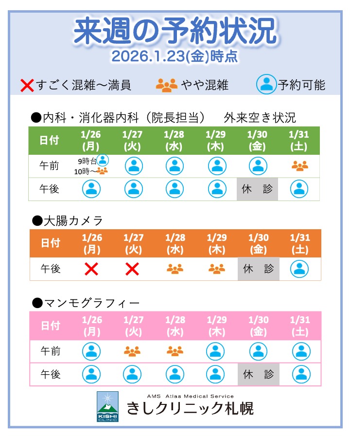 翌週以降の状況について,現在の状況を掲示致しますので,予約希望の方はご参考にして頂けますと幸いです.
